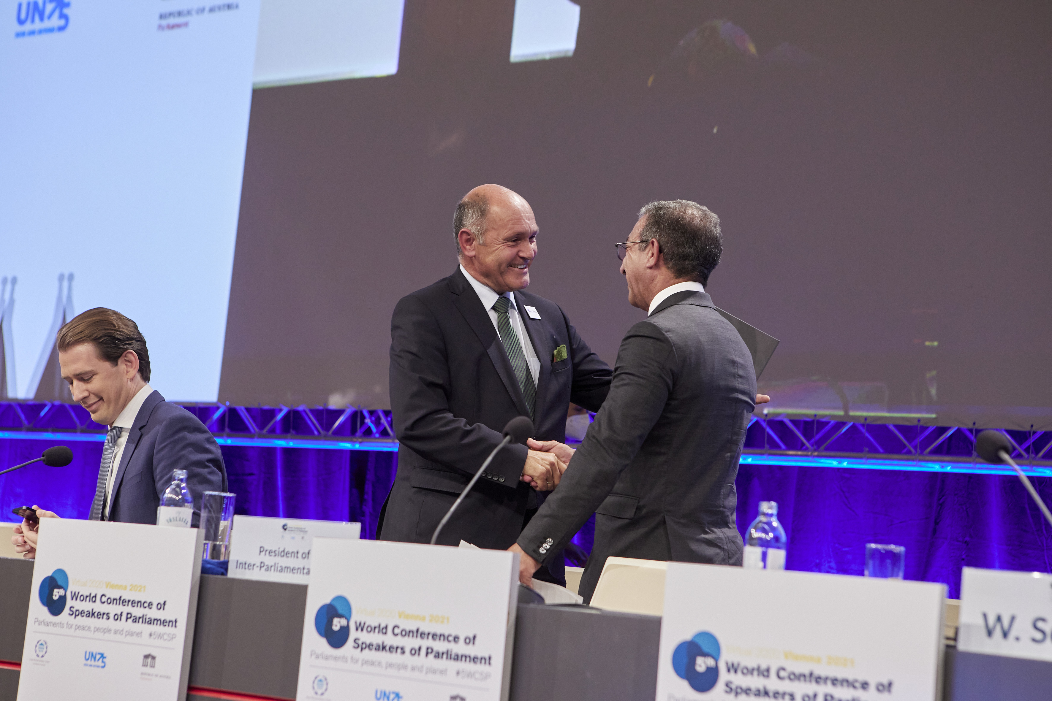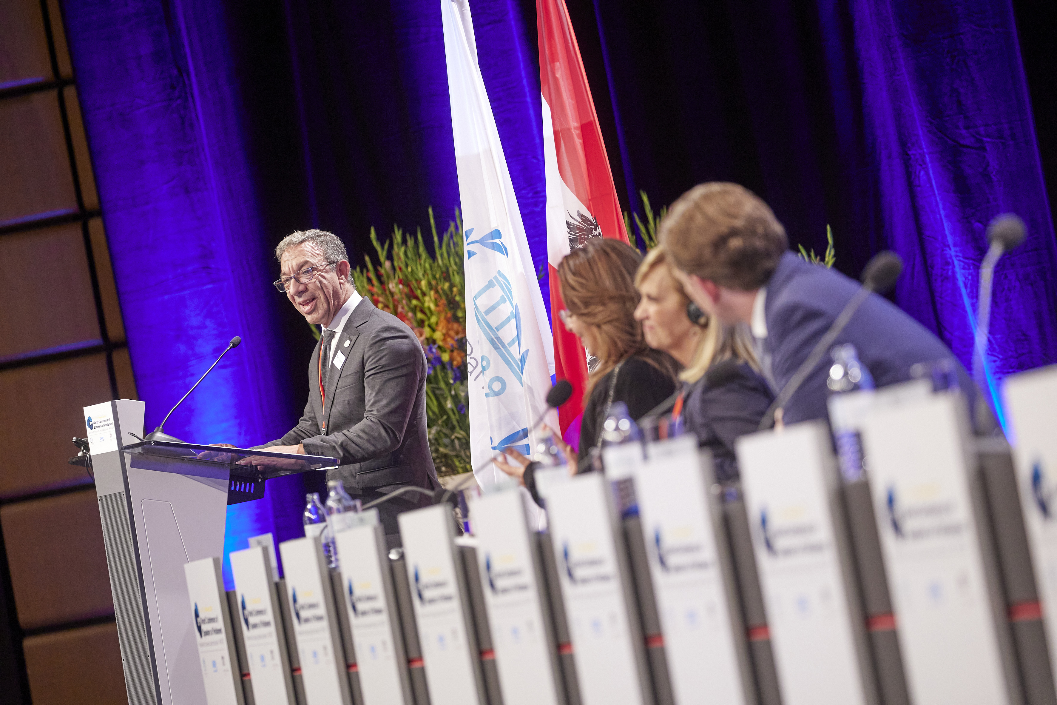 From left: Federal Chancellor of Austria, Mr. Sebastian Kurz, Mr. Wolfgang Sobotka, President of the National Council (Austria) , PACHECO, Duarte (Mr.), President of the IPU - Closing session
